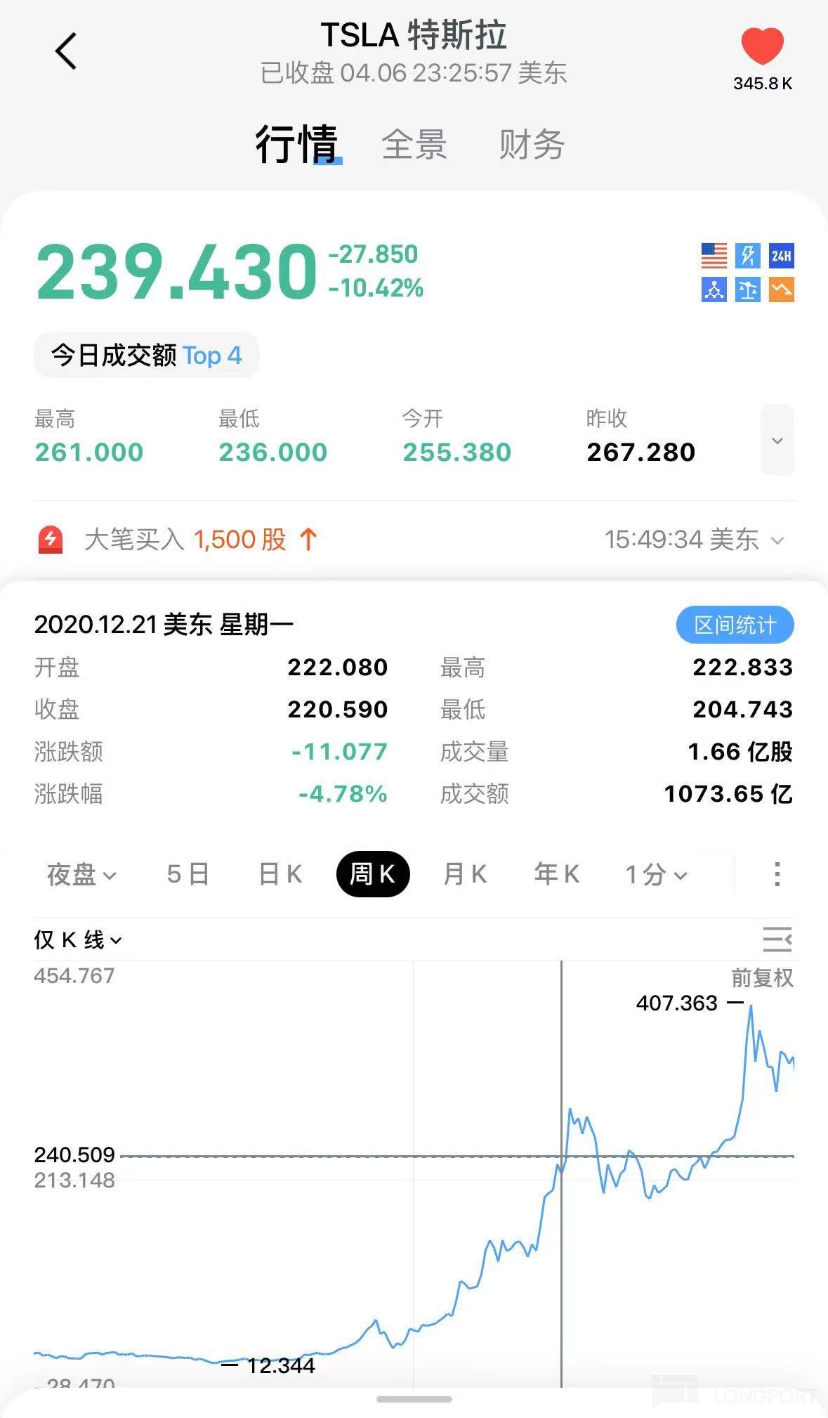 受關税影響,市場擔憂其全球供應鏈及需求放緩,加之電動車行業競爭加劇,特斯拉成為七巨頭中跌幅最大的股票。特斯拉當前股價較 2024 年最高點下跌超 50%,上個交易日收盤 239.43 美元,今日夜盤繼續跌超 8%,現報 220.35 美元。對應價格可以追溯到 2020 年年底(當年特斯拉暴漲後達到的小峯值)。