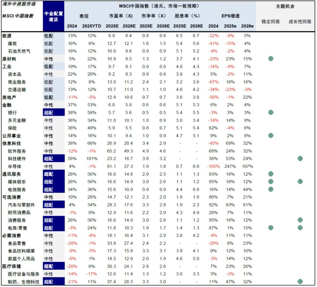 行业上,我们建议聚焦分红、科技、出海、新消费等领域,超配银行、电信、科技硬件、媒体娱乐、新消费、生物科技等,标配原材料、公用事业、必需消费,低配能源、地产和部分工业。