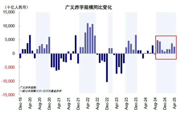 如果要一次性弥补疫情以来的产出缺口,我们测算年需新增 6-8 万亿元财政支出。1)2020-2024 年累计产出缺口为 3.9%,基于财政乘数 0.8 的假设,若 2025 年恢复至潜在产出水平(隐含实际 GDP 增速 8.9%),需额外约 6 万亿元财政扩张;2)广义财政赤字脉冲回升至历史高点,同样也需要约 6 万亿元新增支出;3)若使社融整体增速回升至 10% 的合意水平,需要新增 8 万亿元发债。