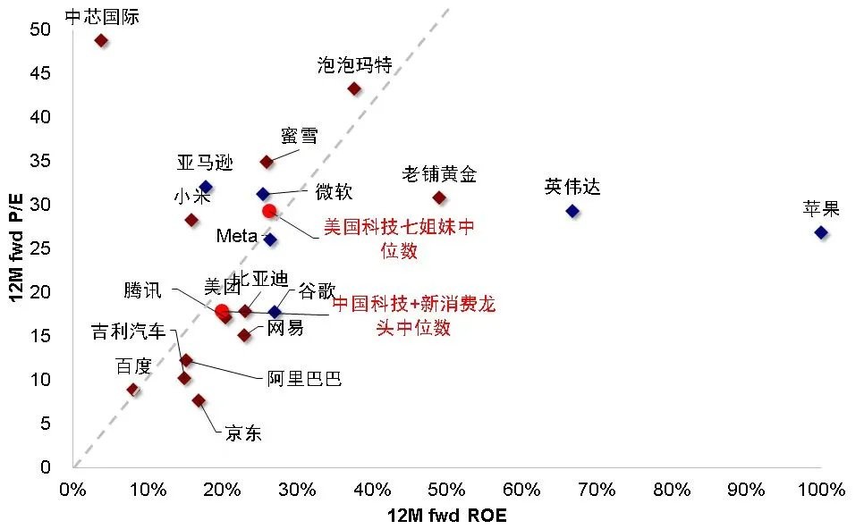 图表 12:中国科技与新消费龙头动态 P/E 低于美国科技股,但 ROE 也低于美国