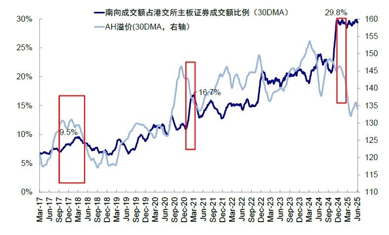 对南向投资者而言,港股市场的长期配置价值依然存在,但短期透支后也会有波动。需要指出的是,南向资金的定价权虽然在边际上和结构上都不断提升,但面对可以借券卖空的外资与无法参与的配售,不存在绝对的定价权。今年以来,港股 IPO 与配售的激增,也会对市场造成扰动,尤其是当情绪和估值较为极致的时候。此外,近期内地公募新规提出强化业绩比较基准,目前约 70% 的基金较基准超配港股(基准中港股相关指数权重均值 16.5%),但公募在南向中占比只有 9.6%,即便减持也影响可控。