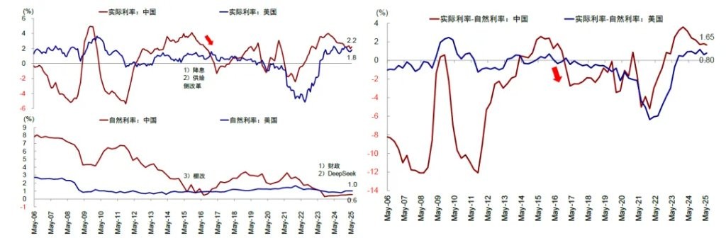 问题的核心是居民和企业的回报预期仍低于成本,重点是差距而不在绝对水平。举例而言,过去几年持续的货币宽松使居民部门的购房成本已经低于 3%,明显低于美国的 6.5%,但面对一线城市平均不到 2% 的租金回报,这一水平依然不够低,这也是为何近些年房地产的每一轮反弹都无法长期持续的原因。从整体经济角度看,作为成本的实际利率(2.2%)依然低于作为回报的自然利率(0.6%),两者的差距(1.6ppt)甚至大于美国(0.8ppt)。