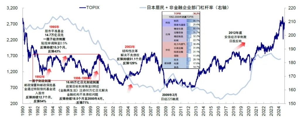 ► 做波段:日股从 1990 年高点持续超过 20 年的回调过程中,并非一成不变的单边下跌,期间至少出现四轮幅度在 50% 以上、持续时间超过 12 个月之久的反弹行情。这些反弹行情背后均有政策支持,但随后再创新低,说明政策发力推动市场反弹并不难,但如果不能彻底解决根本的 “去杠杆” 问题且无法 “对症下药” 的话,最终也难以持续。