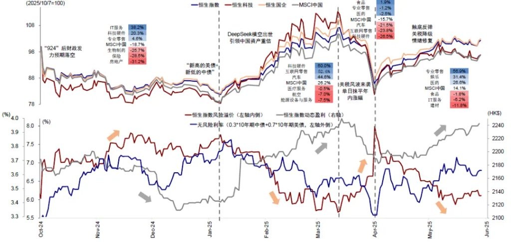 ► 风险溢价快速回落后已计入充分,无风险利率仍有部分下行空间。关税风波过后,风险溢价已从关税初期的 8% 快速回落,尤其双方关税下调后恒指风险溢价已下降至最低 5.9%,接近今年 3 月中旬以及 2023 年初市场高点时水平。不过我们认为当前的关税水平显然并不意味着不确定性已经消除,甚至当前的水平可能是未来一段时间 “最好” 的情形。后续国内政策尤其是财政发力以及科技领域的突破等方面也是带动情绪修复的重要催化剂。短期看,无论是 DeepSeek 资产重估、去年 “924” 行情、还是 2023 年初疫情放开时期的市场情绪,恒指风险溢价 6% 似乎是一个重要的关口,短期情绪修复的空间或许有限。