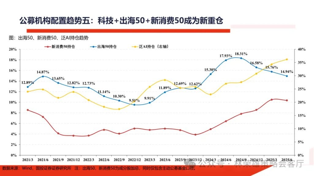 自去年 A 股 924 行情以來,市場信心逐漸增強,尤其是 2025 年初的 AI 新科技、軍工科技和創新藥等領域。中期悲觀預期被系統性扭轉,主動型基金倉位上升至 84.25%,增持泛科技和大金融。新舊動能轉換中,港股成為新核心資產,出海成為 A 股成長關鍵。2025Q2 公募主動型基金對 AI、科技、新消費等領域的配置持續增加,港股持倉佔比接近 20%。