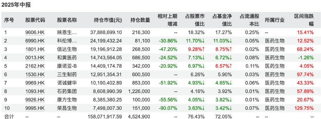 張韡今年格外突出的業績主要是在於她超前配置了一批港股創新藥股。從匯添富香港優勢精選的基金季報就可以發現,她在年中配置的是個重倉股中,只有一隻區間是負收益,其餘九隻都是正收益,其中榮昌生物的漲幅超過 129%。