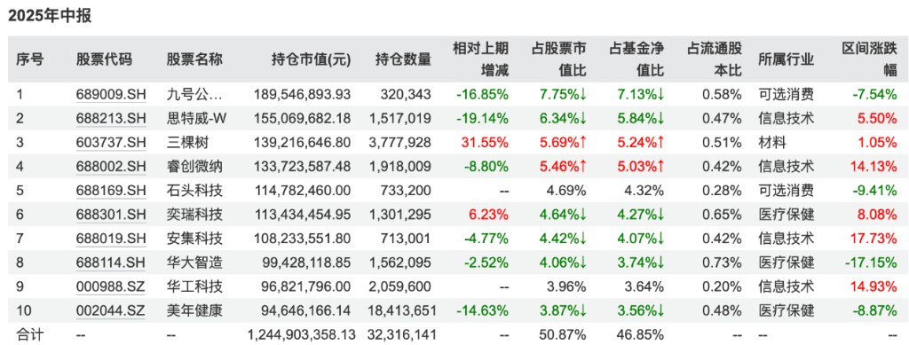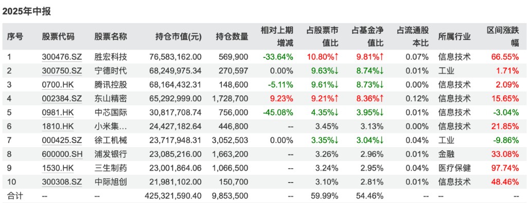 以他管理的景順長城創新成長基金二季報為例,精測電子、三一重工退出十大重倉股,石頭科技、華工科技新入十大重倉股(下圖)。
