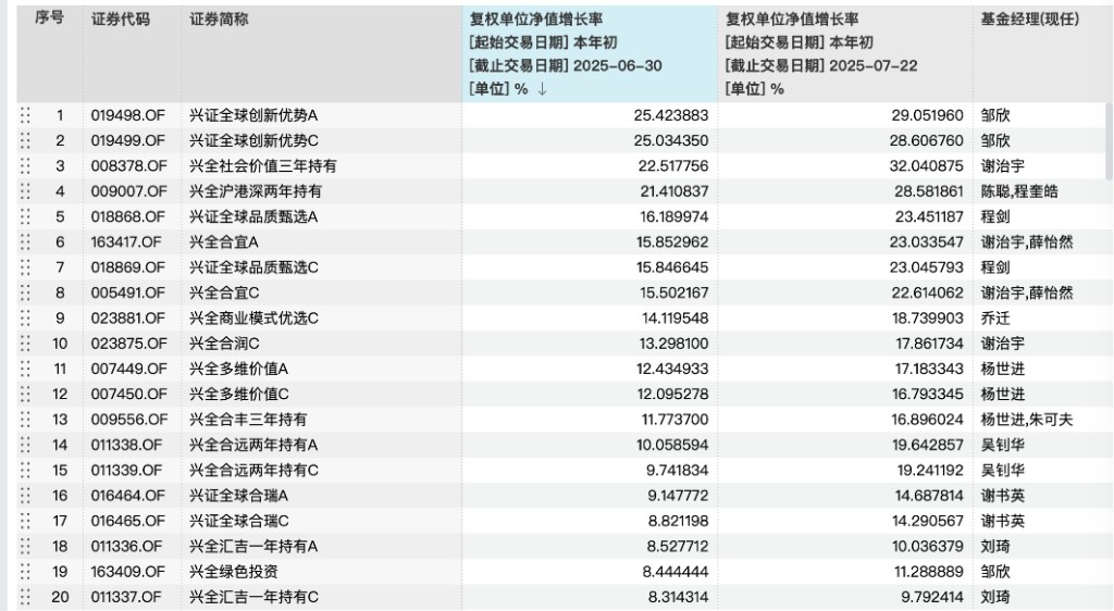謝治宇的逆襲,同時也標誌着興全旗下股基業績的批量復甦,考慮興證全球內部歷來有很好的 “交流” 氛圍,從年初至今(截至 7 月 22 日),他們麾下產品有批量漲幅不錯。