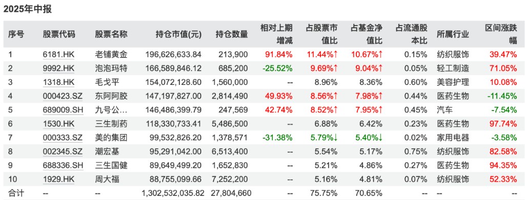 以新消費為例,泡泡瑪特、老鋪黃金和毛戈平都是焦巍的重倉公司。另外,焦巍的黃金股也從一隻鋪開到 3 只,新加倉的是周大福和潮宏基。