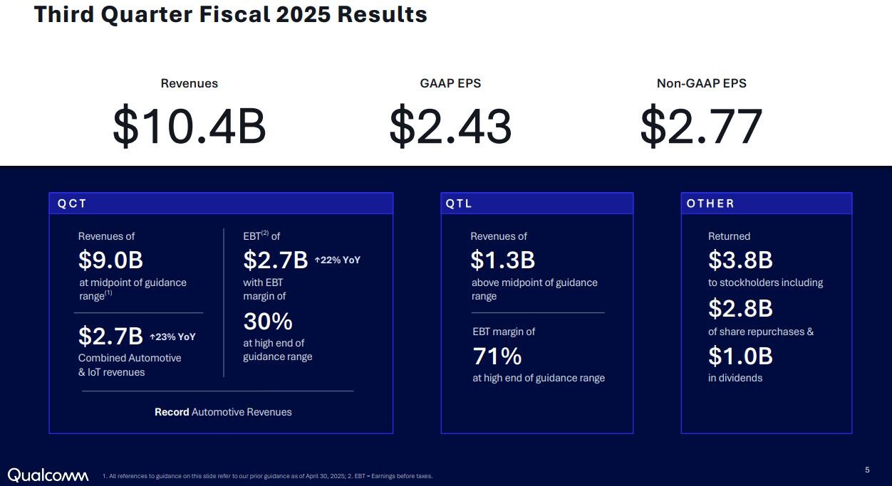 美東時間 7 月 30 日週三美股盤後,高通公佈截至自然年 2025 年 6 月 29 日的公司 2025 財年第三財季(下稱二季度)財務數據,提供第四財季(下稱三季度)的業績指引,前一財季下稱一季度。