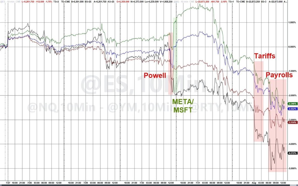 美國疲軟的就業數據,徹底打破了 “勞動力市場依舊強勁” 的敍事,降息預期急劇升温。與此同時,特朗普政府再推一攬子關税舉措,疊加地緣局勢驟然緊張,避險情緒高漲。標普 500 指數錄得 5 月以來最大跌幅,小盤股受創最重,VIX 恐慌指數突破 20,亞馬遜領跌科技七巨頭。