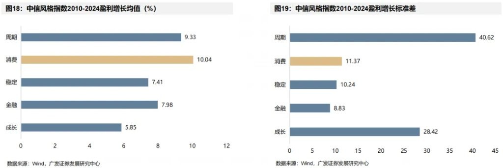 从定量角度验证,以中信风格指数为样本,统计2010–2024年各风格年度归母净利润增速的均值与标准差可进一步验证消费风格的强匹配度:据Wind统计,消费风格指数盈利增速均值达10.04%,居各风格之首,体现出良好的长期成长性;同时标准差仅为11.37%,远低于周期(40.62%)和成长风格(28.42%),显示出消费板块在保持增长同时具备更强的稳定性与抗波动能力。