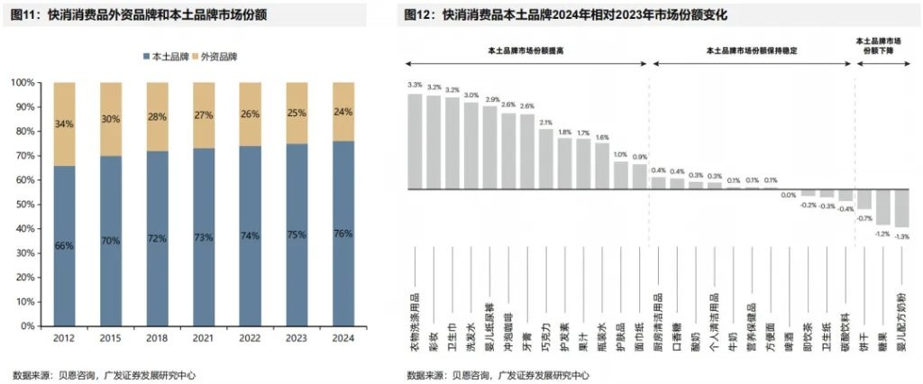 根据贝恩咨询数据,从快消消费品口径看,本土品牌持续抢占外资品牌市场份额,本土品牌市场份额已从2012年的66%提升至76%,产品呈现国产化趋势。