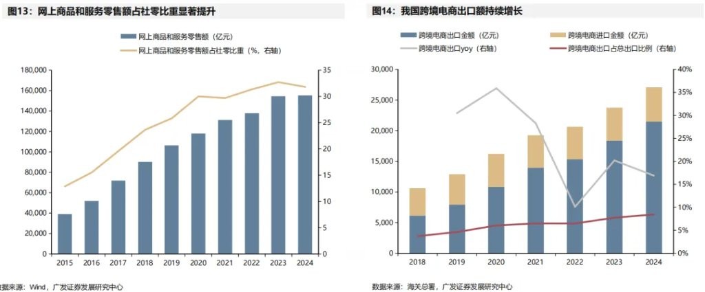 另一方面,跨境电商出口额占总出口额的比例大幅增长,根据海关总署数据,跨境电商出口额占比已从2018年的3.73%提高至2024年的8.45%。其中,从出口目的地看,美国(37.4%)、英国(8.7%)、德国(4.7%)、俄罗斯(4.6%)、法国(3.7%),合计占跨境电商出口总额近6成。泰国(2.5%)、越南(2.4%)、马来西亚(2.4%)、澳大利亚(2.1%)等新兴市场活跃,是未来跨境电商出口增长的潜力方向。