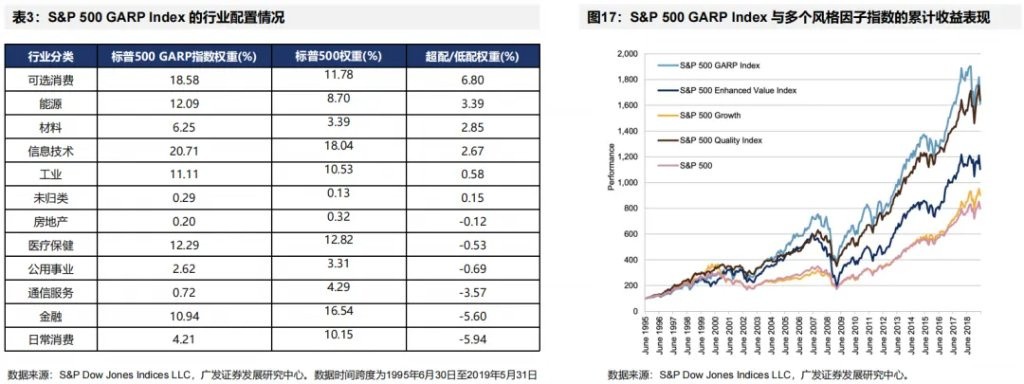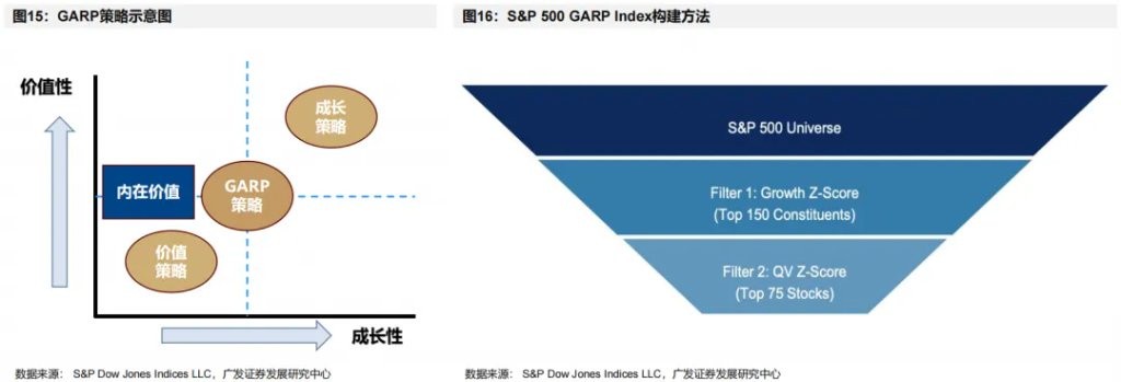 以美国标普500 GARP指数为例,其采用多因子顺序筛选法,首先从标普500指数成分股中,根据三年期每股收益(EPS)和销售收入增长率的Z分数(Growth Z-Score)筛选出成长性排名前150的公司;随后,再基于综合的“质量+估值”因子打分(比如ROE、杠杆率、PE等)筛选出得分靠前的75家公司,作为GARP策略指数的最终成分。