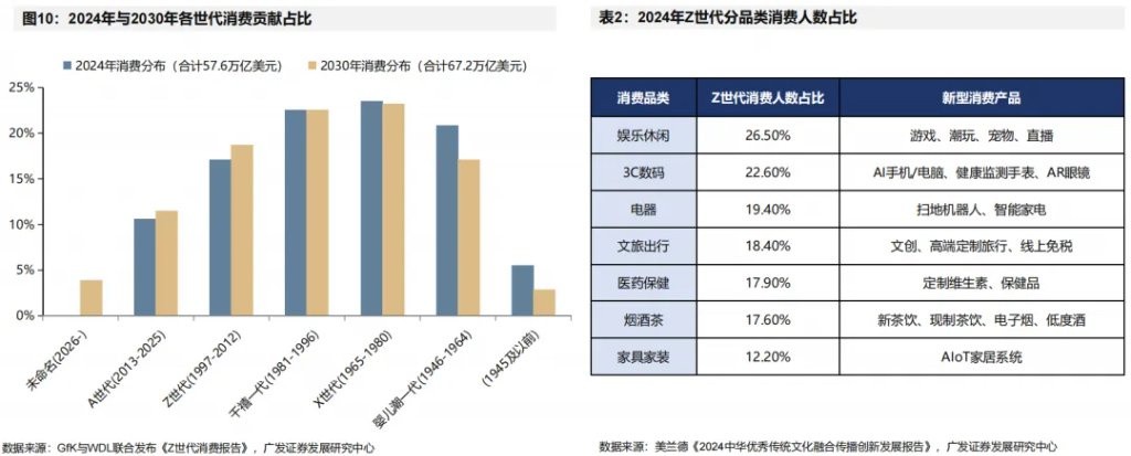 “U”型社会的两头(银发族与Z世代)消费能力最高。根据GfK与WDL联合发布《Z世代消费报告》,Z世代(约15-30岁)2024-2030年的人均支出增长最快,到2030年,Z世代的购买能力将达到12.57万亿美元,年均复合增长率为4.14%。此外,60岁以上老年人(婴儿潮及此前出生)2024年合计消费贡献占比居于首位,购买能力高达15.15万亿美元。