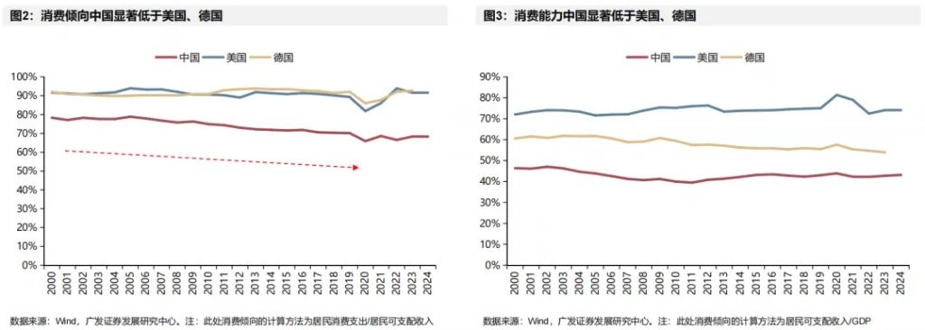 从居民消费率模型看,边际消费倾向(MPC)提升是未来的核心变量。据Wind统计,在我国消费结构中居民消费占比在70%左右,是消费的核心组成部分。居民消费率=居民消费支出/GDP=(居民消费支出/居民可支配收入)*(居民可支配收入/GDP)=消费倾向*消费能力。当前居民消费面临双重约束: 一是我国居民消费能力显著低于美国、德国等发达国家,但收入约束导致消费能力短期难以快速改善;二是受宏观经济预期等因素影响,消费倾向持续下行,抑制存量储蓄向消费的转化,降低总需求。基于凯恩斯有效需求理论,短期政策有望通过提升居民边际消费倾向(MPC)激活经济循环的“乘数杠杆”,焕发经济活力。