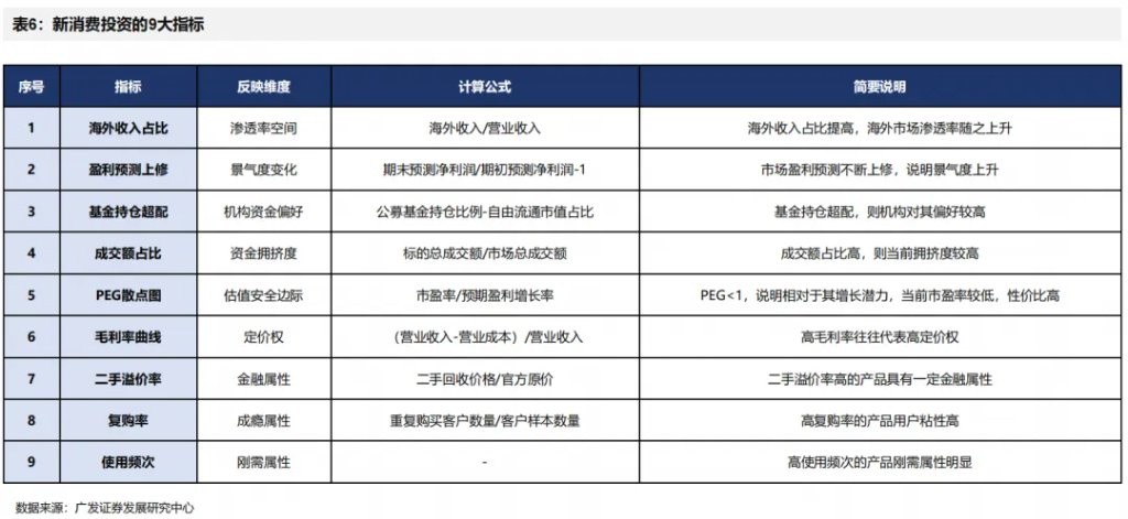 第三,【9大】指标指引新消费投资,包括①从海外收入占比看渗透率空间、②从盈利预测上修看景气度变化、③从基金持仓超配看机构资金偏好、④从成交额占比看拥挤度情绪、⑤从PEG散点图看估值安全边际、⑥从毛利率曲线看定价权、⑦从二手溢价率看金融属性、⑧从复购率看成瘾属性、⑨从使用频次看刚需属性。