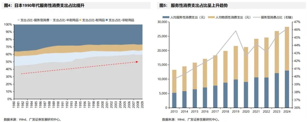 服务型消费可能是中国未来宏观经济的刚需方向。与日本90年代近似,随着Z世代成长,社会消费结构正在发生调整,服务型消费的支出占比不断提升。与此同时,与服务型消费联系紧密的情绪消费、悦己消费等新消费不断涌现。