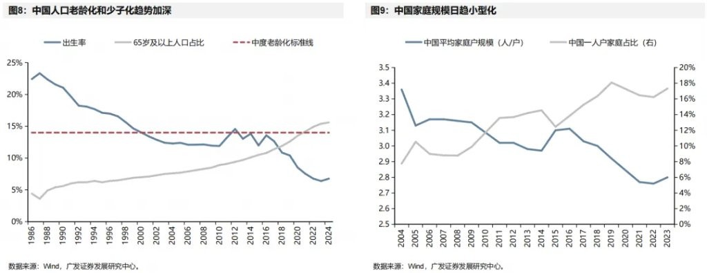 中国人口结构已经呈现“U型”分化,一方面,据Wind统计,2024年我国65岁及以上人口占比为15.6%,已超过国际中度老龄化标准(14%),银发一族拥有宽裕的经济基础、充裕的休闲时间,在文旅支出方面扩张消费,“主动享老”成为新范式。另一方面,我国人口出生率长期呈现下行走势,社会“少子化”不断加剧,平均家庭户规模持续下降,Z世代更愿为“悦己”、“情绪价值”支付溢价,目前已逐渐成长为新的消费主体。