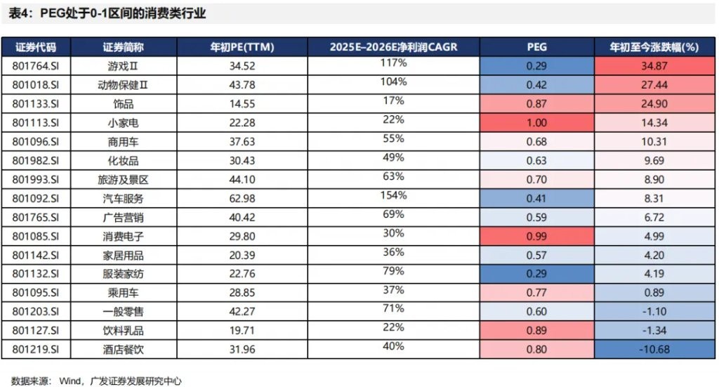 此外,在申万二级行业层面,以PEG为核心的GARP估值策略在年初至今的指数收益率中展现出一定的筛选有效性:PEG处于0–1区间的多个消费子行业在年初至今取得较好表现,如游戏Ⅱ(PEG=0.29,涨幅34.87%)、动物保健(PEG=0.42,涨幅27.44%)、化妆品(PEG=0.63,涨幅9.69%)等,兼具合理估值与成长性,跑赢大盘。