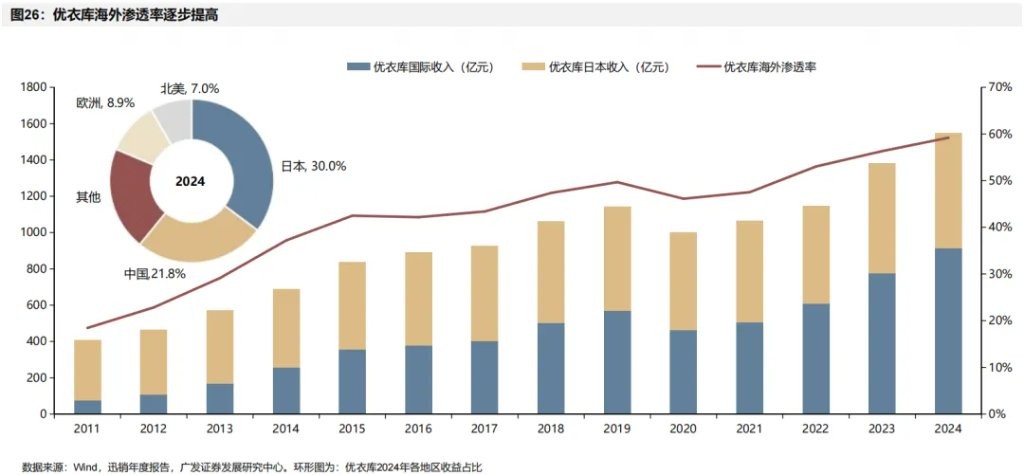 其中,以海外渗透率提升为标志的优衣库是品牌出海经典范例。1998年,优衣库凭高性价比“摇粒绒外套”一炮而红,2001年启动全球化。据Wind与迅销年度报告数据统计,截至2024年,全球门店超2500家。2024财年迅销集团总收益达3.1万亿日元,海外收入占比过半且增速超本土五倍,已成为集团主要利润引擎,彰显全球化战略成效。