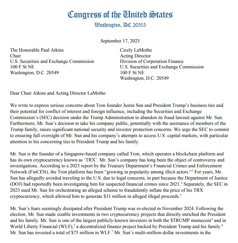Merkley and Casten hinted in their letter that Sun's "huge investments" in cryptocurrency projects controlled by U.S. President Trump and his family—including World Liberty Financial (WLFI) and TRUMP Coin—might have influenced the SEC's decision to suspend its case against him.