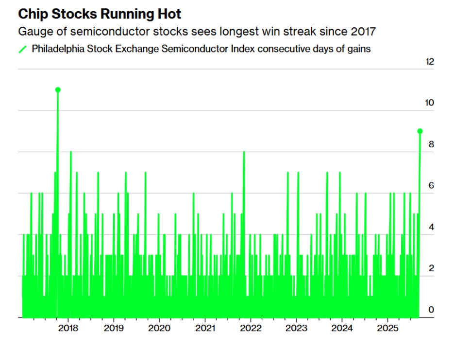 The Philadelphia Semiconductor Index, after a slight decline on Wednesday, has recently continued to attract global capital, leading to sustained increases and new highs. One of the core driving forces behind this round of "long-term bull market in U.S. stocks" since 2023—the chip stocks—has surged since the low in April, achieving the longest continuous upward trend in nearly eight years. As of this Tuesday, the Philadelphia Semiconductor Index has seen nine consecutive trading days of increases, marking the longest streak since 2017, with a cumulative rise of 8.7% during these nine trading days, and a year-to-date increase of as much as 26%, significantly outperforming the nearly 16% increase of the Nasdaq 100 Index during the same period.