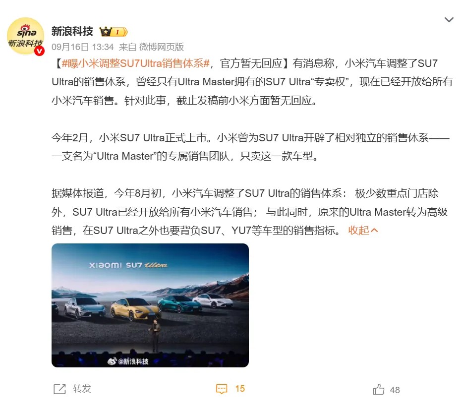 Not long ago, there were reports that Xiaomi Auto adjusted the sales system for the SU7 Ultra, opening sales rights to all Xiaomi Auto sales, while Ultra Masters transitioned to "senior sales," bearing sales targets for models like the SU7 and YU7.