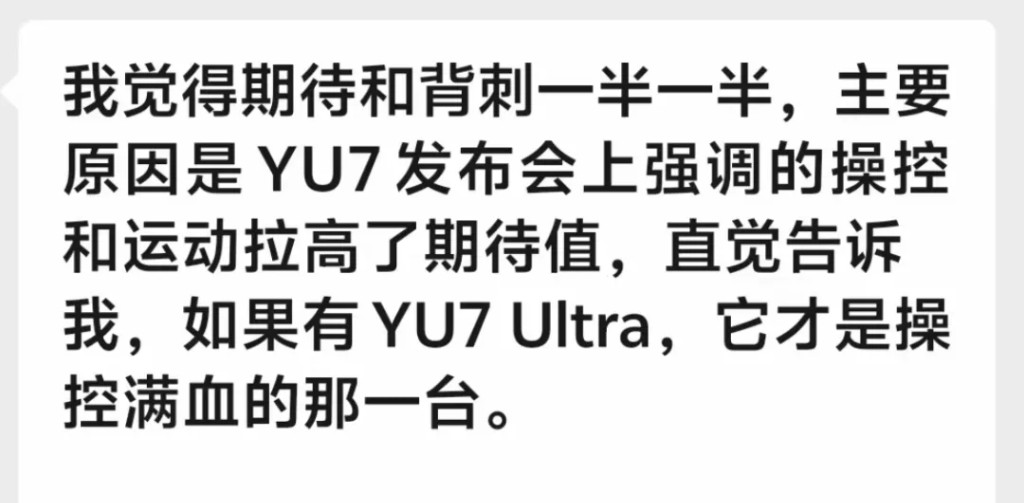 Other owners in the car enthusiast group share similar views; regarding the exposure of the "YU7 Ultra," they are more looking forward to its performance in sporty handling, while being completely satisfied with other aspects.