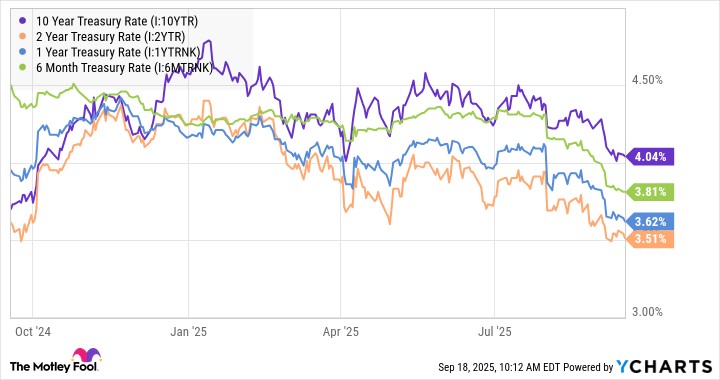 确实,10 年期收益率是最高的;然而,请注意,6 个月期利率高于 1 年期和 2 年期利率。这意味着市场预计利率将在一到两年内下降。