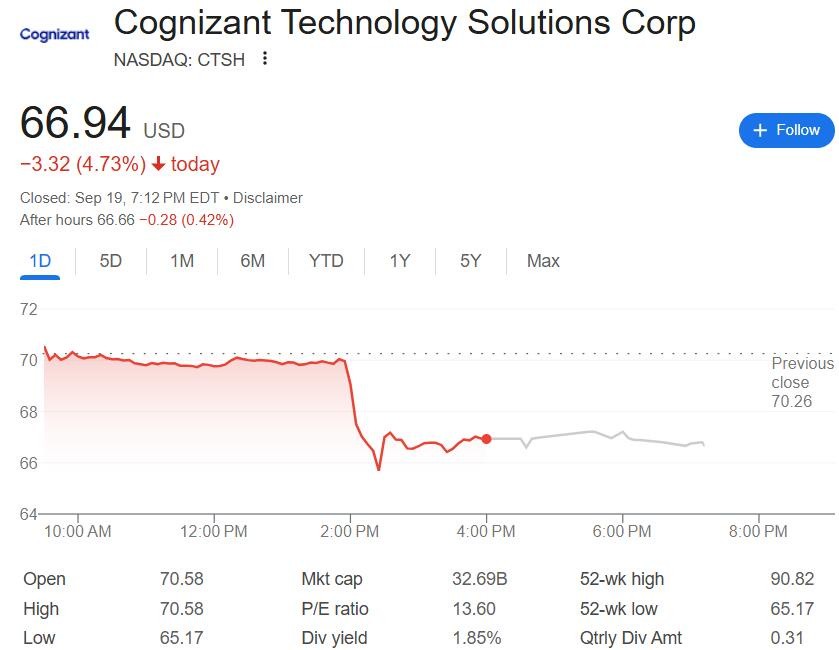 週五傳出 H-1B 簽證新費用的消息後,一些 IT 諮詢公司的股價刷新日低,埃森哲一度跌超 2%,後微幅收漲,高知特(Cognizant)收跌 4.7%。
