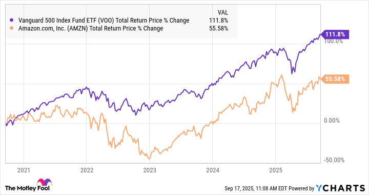 Amazon's stock has gained about 56% over the past five years, meaning a $1,000 investment made on September 17, 2020, would now be worth $1,560. This performance lags behind the S&P 500, which has returned 112% in the same period. Despite this, Amazon's earlier strong performance during the COVID-19 pandemic contributed to its overall gains, and it has outperformed the S&P 500 by 26 percentage points since the start of 2020.