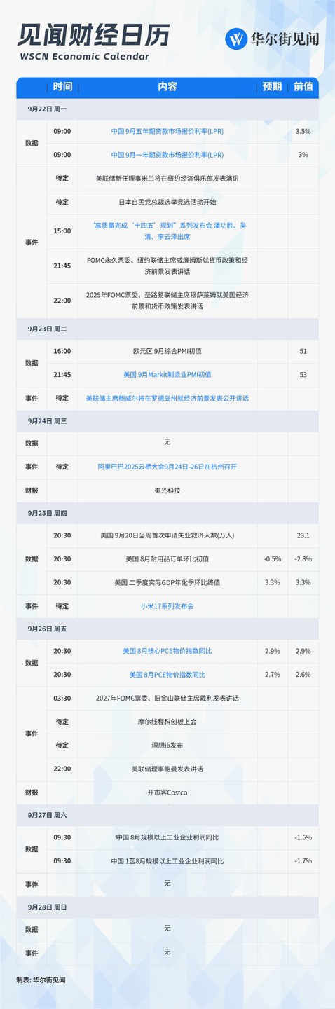 This week's key focus: China's September LPR, US August PCE Price Index, Pan Gongsheng, Wu Qing, Li Yunzhe attending the "14th Five-Year" series press conference, Xiaomi 17 series press conference benchmarked against iPhone, Alibaba 2025 Cloud Habitat Conference, etc.