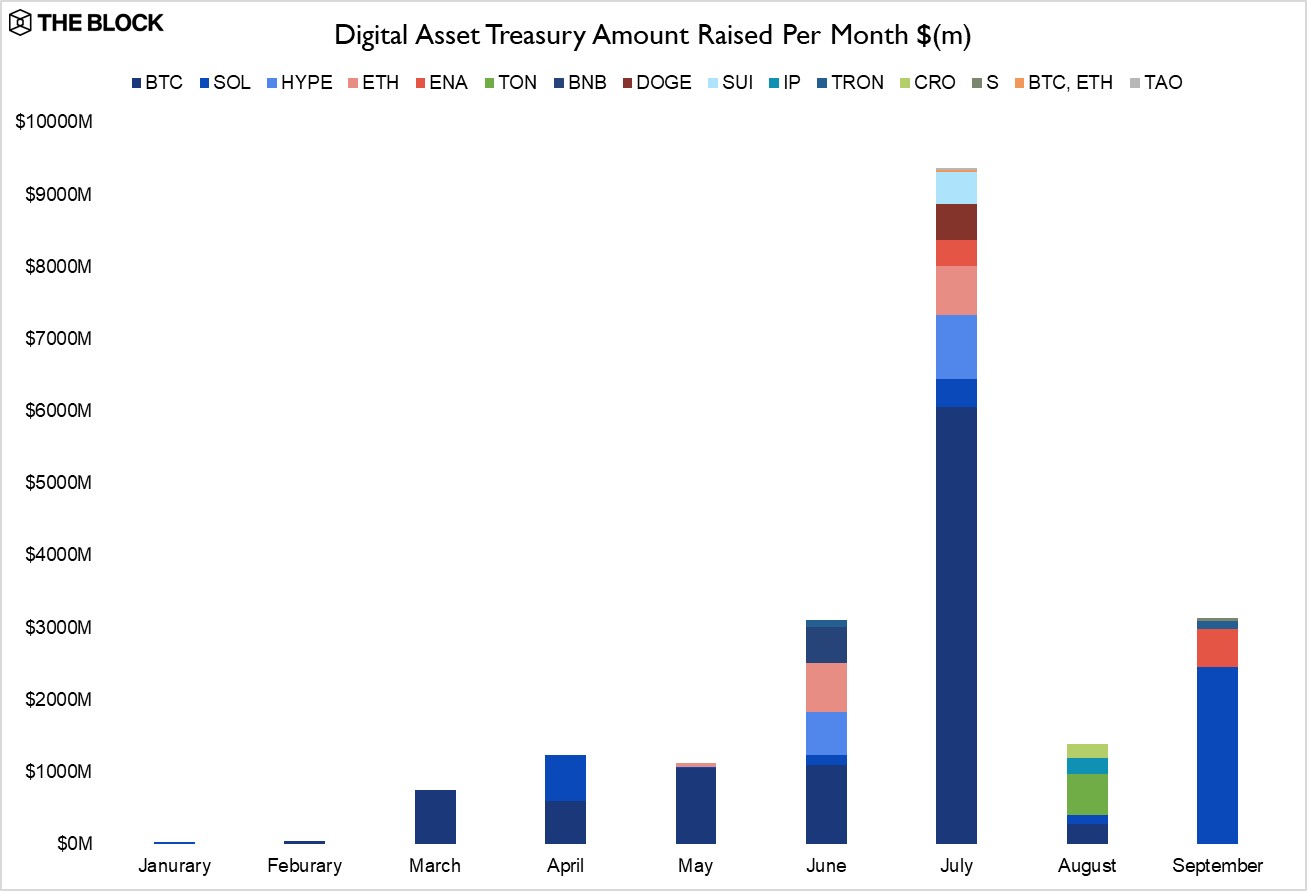 As the hottest sector in the cryptocurrency market this year, digital asset treasury companies (DAT) are witnessing an unprecedented wave of financing: According to the latest data released by The Block, DAT companies have raised over $20 billion so far in 2025, setting a historical record, with nearly $10 billion raised in just the month of July.