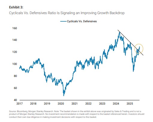 The ratio of cyclical stocks to defensive stocks has risen about 50% from the April low, breaking the downtrend that began in April 2024, and the internal structure of the market clearly signals a better growth backdrop ahead.