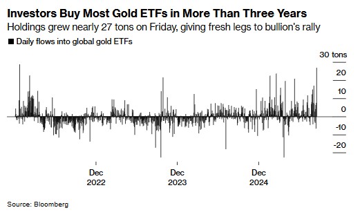 Staunovo noted: "The factors supporting gold prices are changing. Previously, it was mainly driven by central bank purchases and demand from Asian markets, but now, driven by expectations of declining U.S. interest rates, we are also starting to see Western investors intending to increase their gold holdings, which is evident from the changes in gold ETF holdings." Data from the compilation shows that last Friday, the inflow of funds into gold ETFs reached a three-year high, with prices rising by 0.9%, marking the largest single-day percentage increase since 2022. Since the beginning of this year, gold prices have risen by more than 40%.