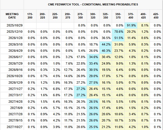 According to the CME FedWatch Tool, investors currently expect two more 25 basis point rate cuts this year, one in October and one in December, with probabilities of 92% and 79%, respectively.