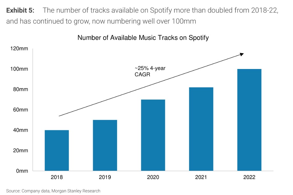 音樂領域同樣如此,製作成本持續大幅下降。AI 工具如ElevenLabs的 Eleven Music 可以直接從文本生成包含人聲和樂器的完整歌曲。這直接導致了內容量的激增,Spotify 平台上的曲目數量已遠超 1 億首。然而,這也帶來了新的問題:音樂平台Deezer報告稱,其每日收到的新曲目中近 30% 是完全由 AI 生成的,其中 70% 的播放行為被判定為旨在騙取版税的欺詐行為。