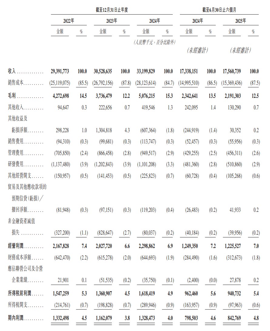 In terms of finance, for the fiscal years 2022, 2023, 2024, and the six months ending June 30, 2025, the company achieved revenues of RMB 29.392 billion, RMB 30.529 billion, RMB 33.2 billion, and RMB 17.561 billion, respectively; during the same period, the profits were approximately RMB 1.332 billion, RMB 1.162 billion, RMB 1.328 billion, and RMB 843 million, respectively.