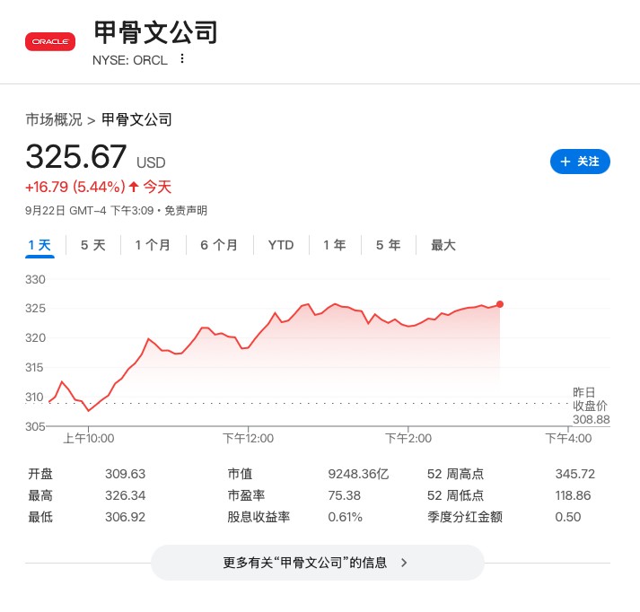 受此消息提振,甲骨文股價週一盤中漲超 5.4%。