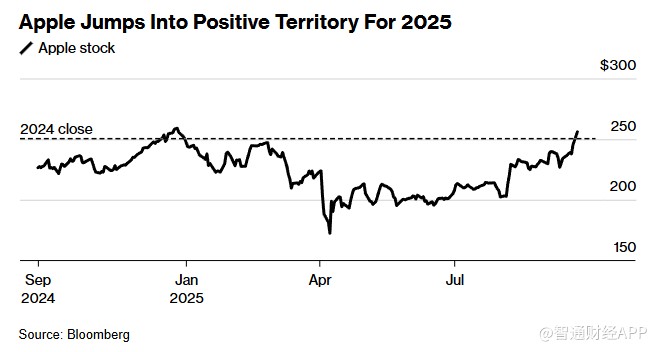 智通財經 APP 獲悉,蘋果 (AAPL.US) 週一實現年內股價轉漲,距離創下歷史新高僅一步之遙。當日該股上漲 4.3% 至 256.10 美元,年內累計漲幅達 2.3%。蘋果股價在四月因關税不確定性跌至低點,當時年內跌幅超過 30%,但自那以來,該股已累計上漲近 50%。