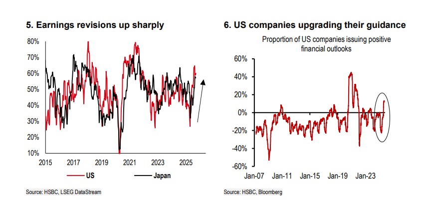 從自下而上的微觀層面看,信號甚至更為明確。報告顯示,主要股指的盈利預期在過去三個月大幅上調,其幅度通常只在經濟週期的早期階段才會出現。同時,美國上市公司自身也正在淨上調其業績指引。