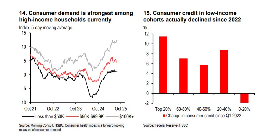 鑑於收入最高的 10% 家庭貢獻了約 50% 的總體消費,他們的強勁支出足以支撐整體宏觀數據,而這正是市場參與者最為關注的。因此,低收入羣體的壓力雖然真實存在,但其對整體經濟的拖累作用相對有限。