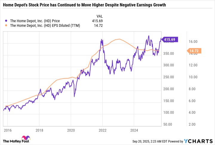 但儘管家得寶的股價接近歷史最高點,其盈利在近年來卻持續下滑——這表明投資者正在超越公司的短期困境,期待復甦。