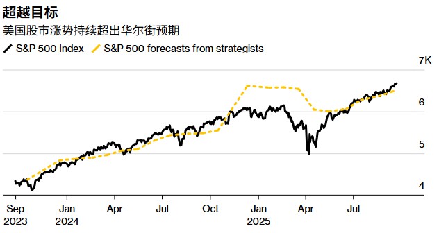 智通財經 APP 獲悉,自年初美股從低谷反彈以來,賣方策略師雖多次上調股市目標位,卻始終低估了本輪上漲的強度。當前標普 500 指數報收 6486 點,較彭博追蹤的行業平均年底預期高出近 3%,僅 2024 年與 1999 年同期出現過如此顯著的預期與實際回報差距。這一差距凸顯華爾街預言家近來多麼頭疼——儘管股指已把特朗普貿易戰陰霾和經濟降温信號甩在身後,但超預期的盈利增長、AI 科技股狂熱及美聯儲降息前景,仍持續掩蓋了潛在風險。