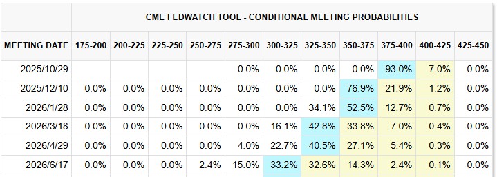 交易員們仍預計美聯儲將在 10 月和 12 月降低利率,儘管本月早些時候已下調了 25 個基點。目前,根據 CME 美聯儲觀察工具,市場預計美聯儲將在 10 月與 12 月各降息 25 個基點的概率分別為 93% 與 77%。