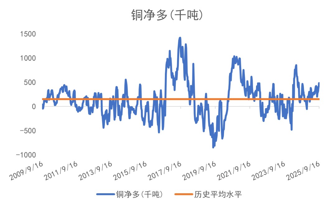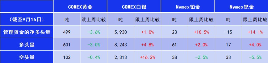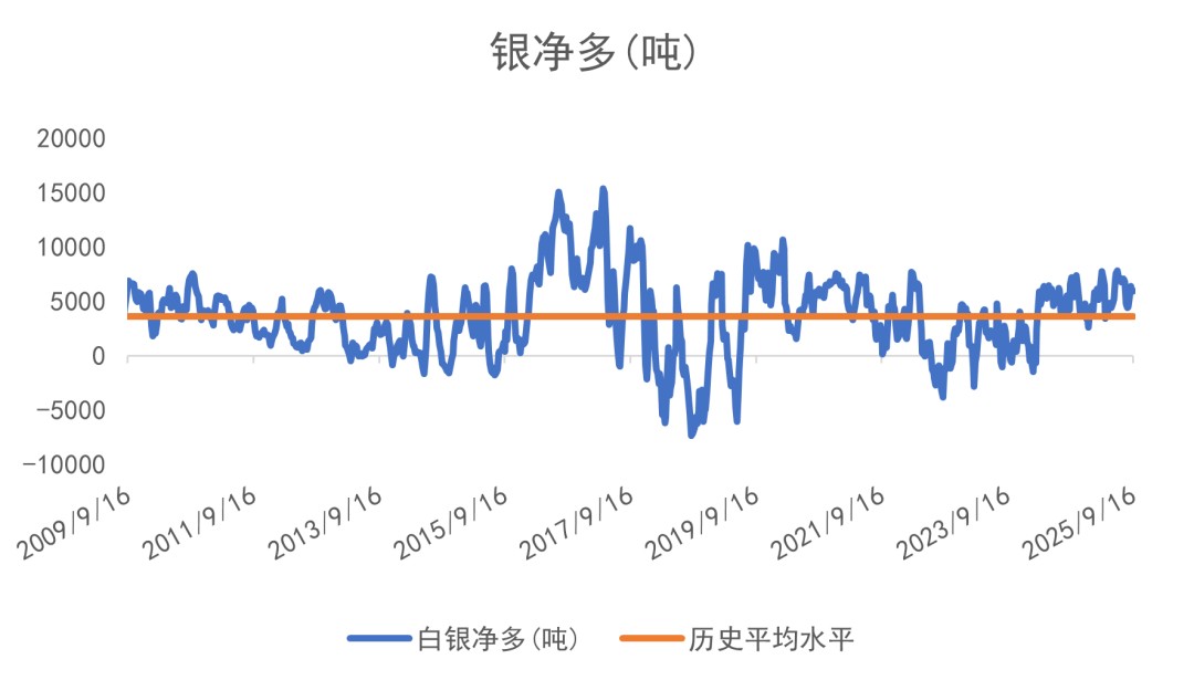 Silver, which has a high correlation with gold prices, has always been more volatile than its rich cousin. The long positions of U.S. silver rose by 5% week-on-week; short positions increased by 16%, resulting in net long positions rising from 5,874 tons to 5,930 tons, marking the 82nd consecutive week of net longs, also 39% of its peak period. As of September 16 this year, the dollar silver price has accumulated a 47.2% increase this year, while the long positions of silver funds have accumulated a 40.4% increase (last week +34.0%), and short positions have accumulated a 28.9% decrease (last week -38.8%).