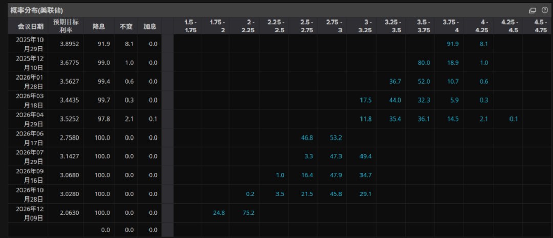 Currently, the market believes that the probability of a 0.25% rate cut in October has risen from 85% to 91.9%, and the probability of a rate cut in December has also increased from 75% to 80%, estimating that there will be approximately three rate cuts this year. The market expects that by June next year, the U.S. interest rate may be about 1.5% to 2.5%-3.0% lower than it is now.