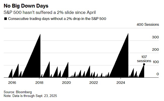 The US stock market is staging a "calm bull"! The S&P 500 has experienced a decline of no more than 2% for 107 consecutive days, marking the longest period of stability in over a year